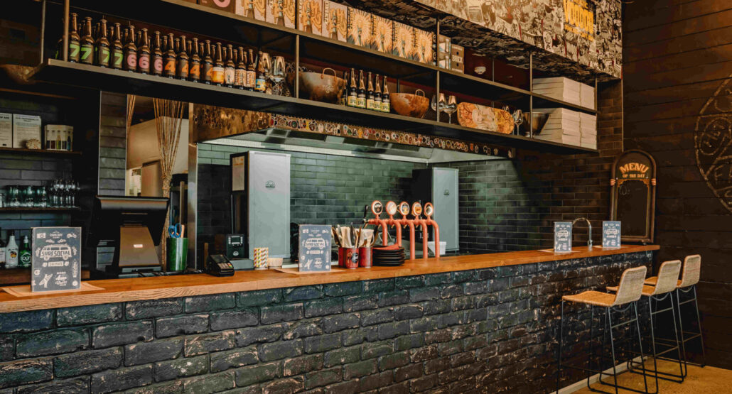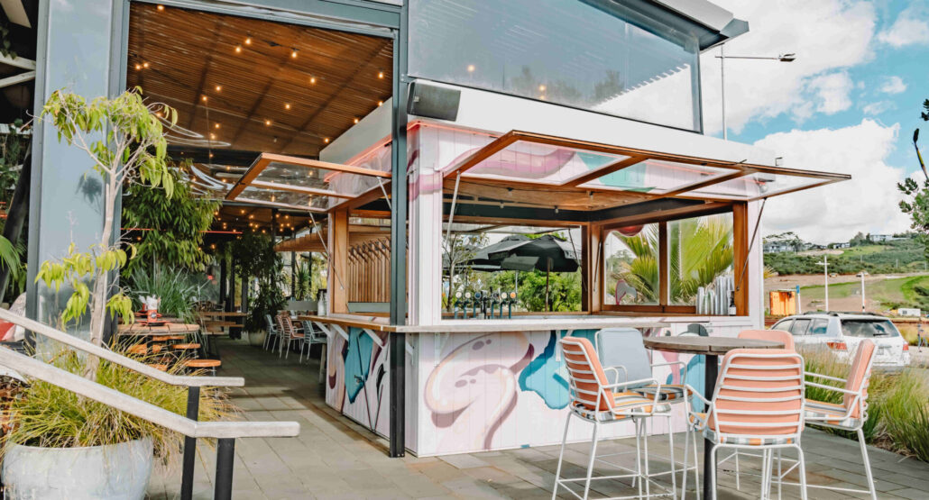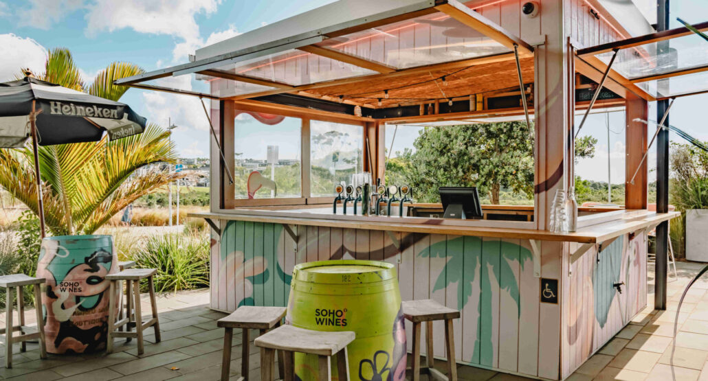 The Cabana features a fully functioning bar with beer on tap, fridges stocked with wines, spirits, and mixers, plus two soda guns. The surrounding blinds can be adjusted based on the weather, and heaters provide extra warmth during colder months.